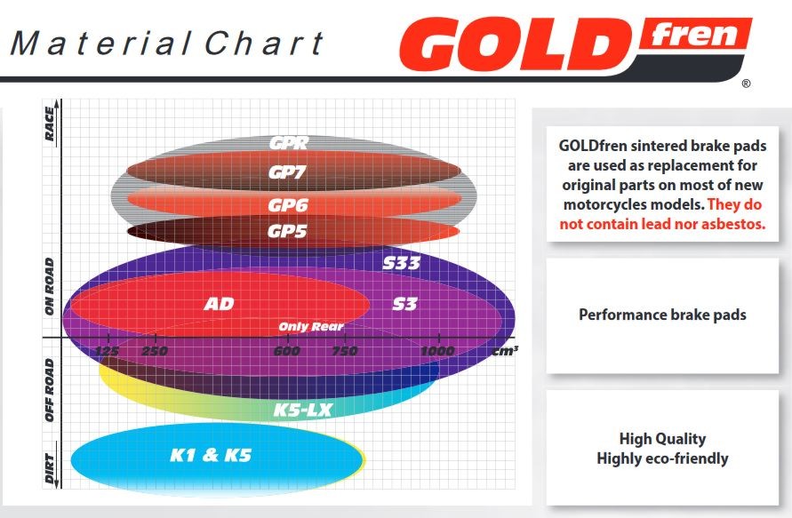 GOLDFREN Ceramic-Carbon Bremsbeläge bestehen aus einem Metall-Keramik und Graphit-Eisen Gemisch. Hoher statischer Reibungskoeffizient, hohe Bremskraft bis zu 500°. Kein Ablösen des Bremsmaterials, da mit der Trägerplatte verlötet. Kein unnötiger Bremsscheibenverschleiß. Ca. 3-mal längere Lebensdauer als organische oder Kevlar Bremsbeläge.